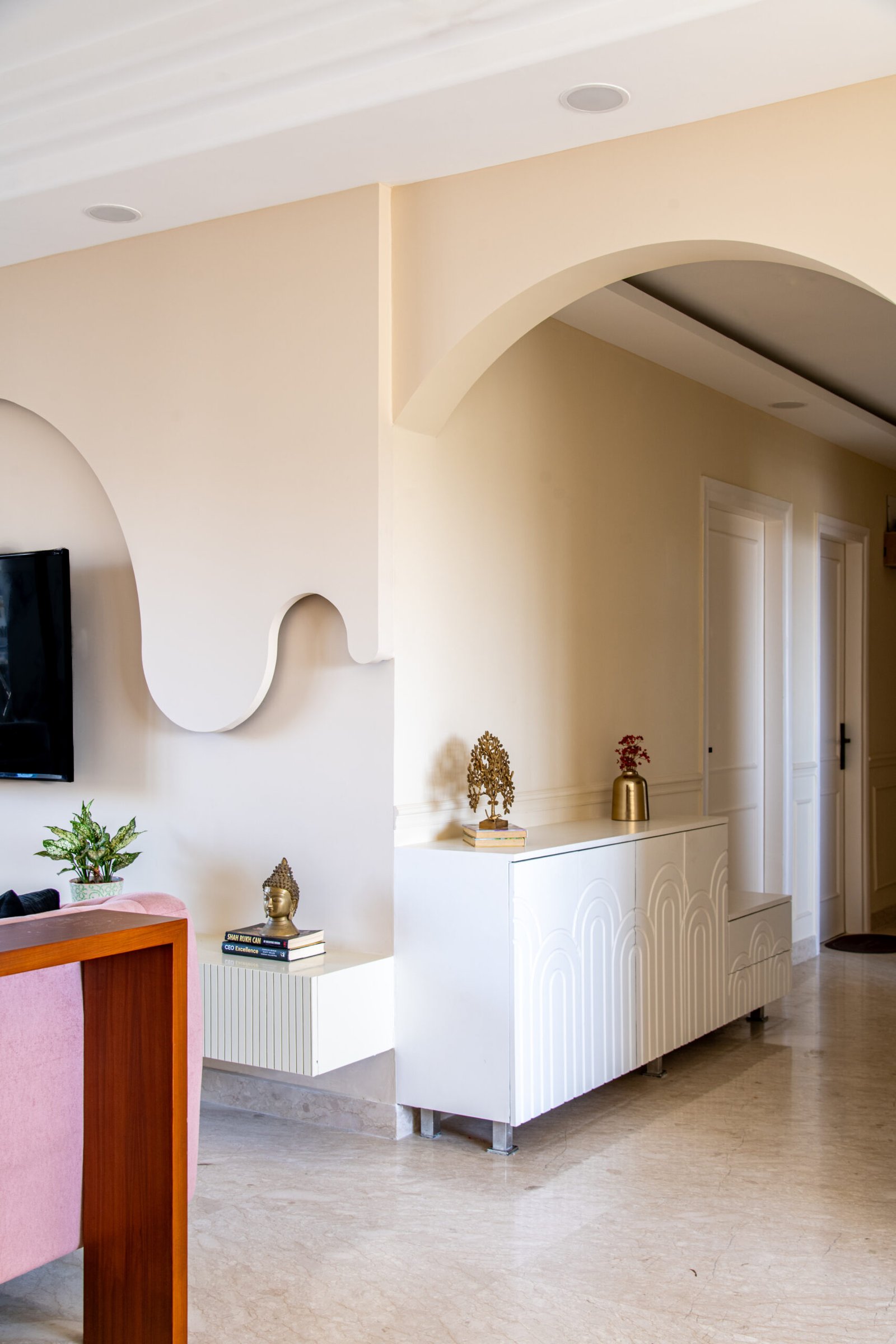 This home was designed for a young couple and their extended family across three generations — a calm, modern refuge that still feels deeply human. Soft pastels in blush and beige create a soothing backdrop, while subtle gold accents add a quiet sense of luxury. Rooms are layered with tactile textures and pared-back forms so the interiors read chic yet inviting; natural light filters through every corner, and the parents’ bedroom becomes a nurturing cocoon of comfort and style. The children’s room is playful and practical — an aviation mural, rounded-edge furniture and clever storage make it a creative sanctuary that grows with the child