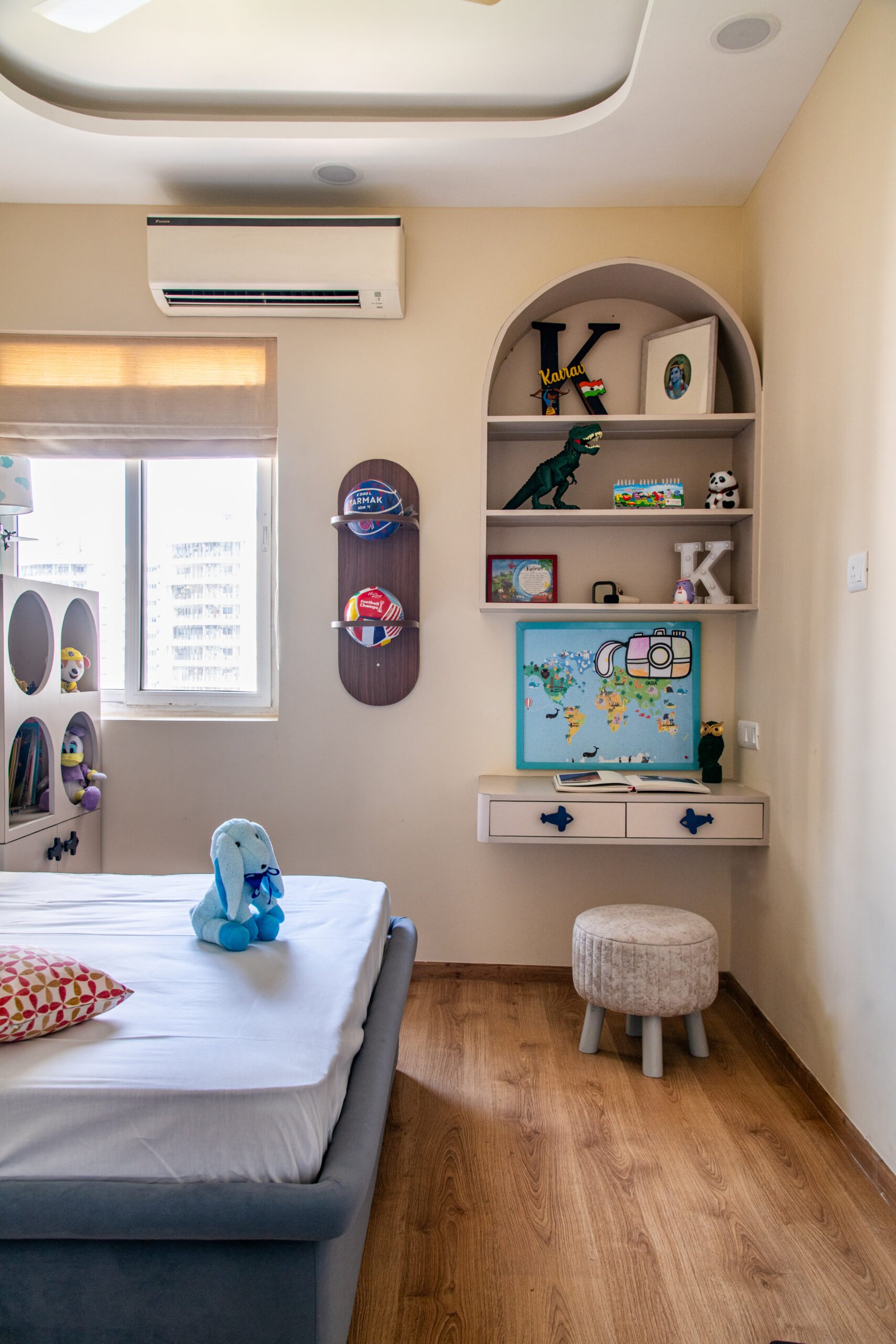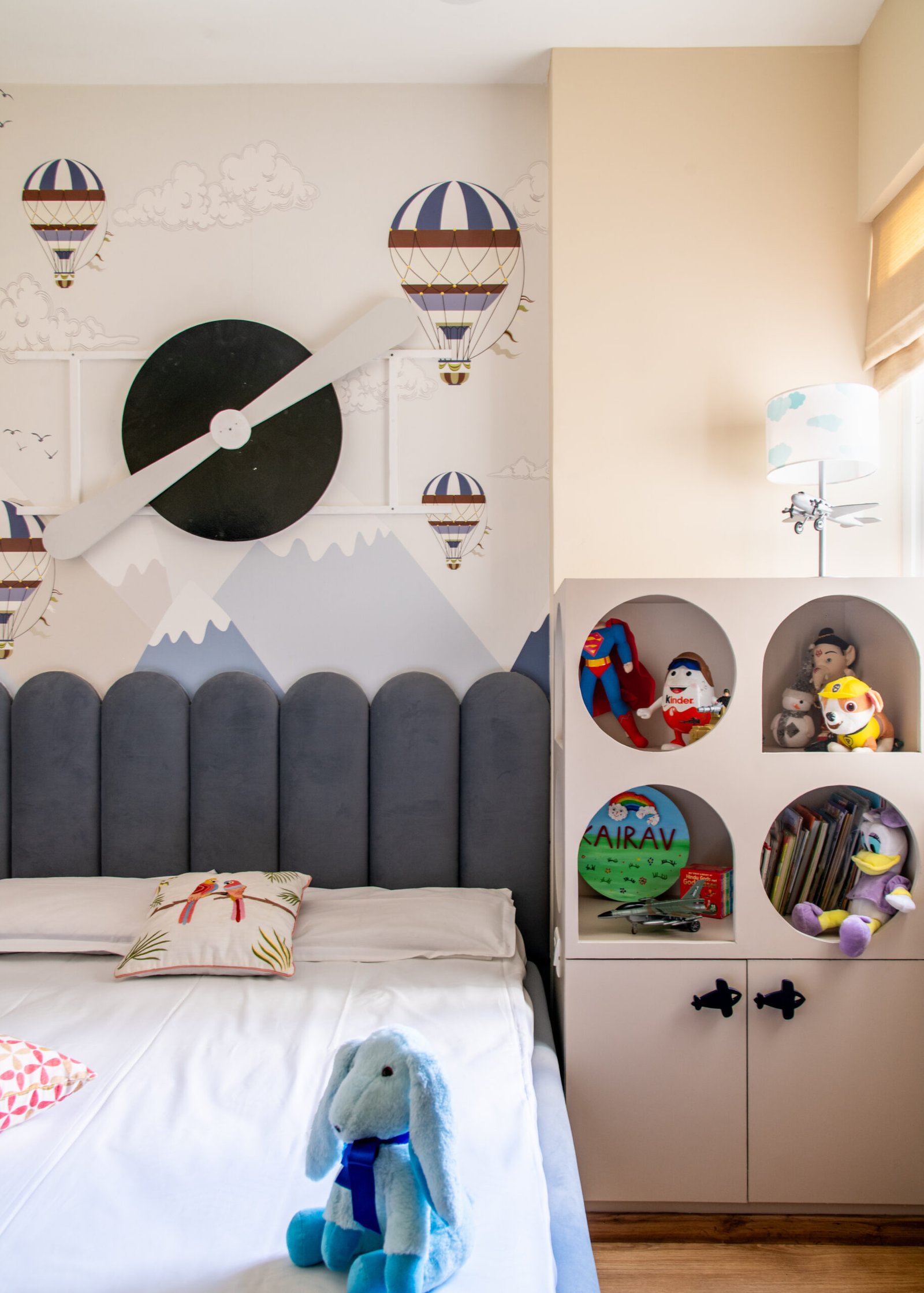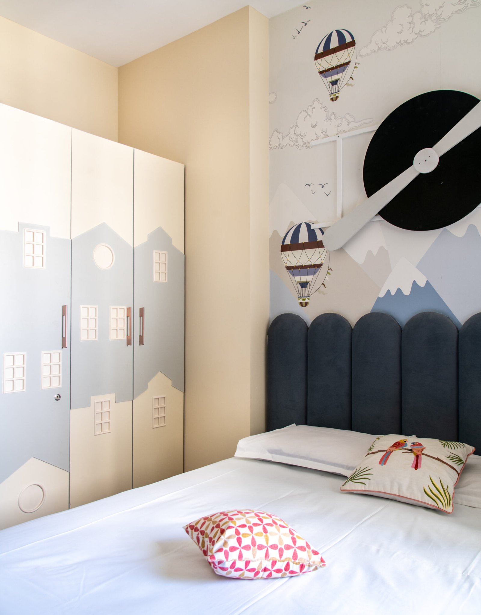 We used compact built-ins, a multi-use study nook, smart storage for toys and clothes, and a mural to create visual depth without crowding the space.