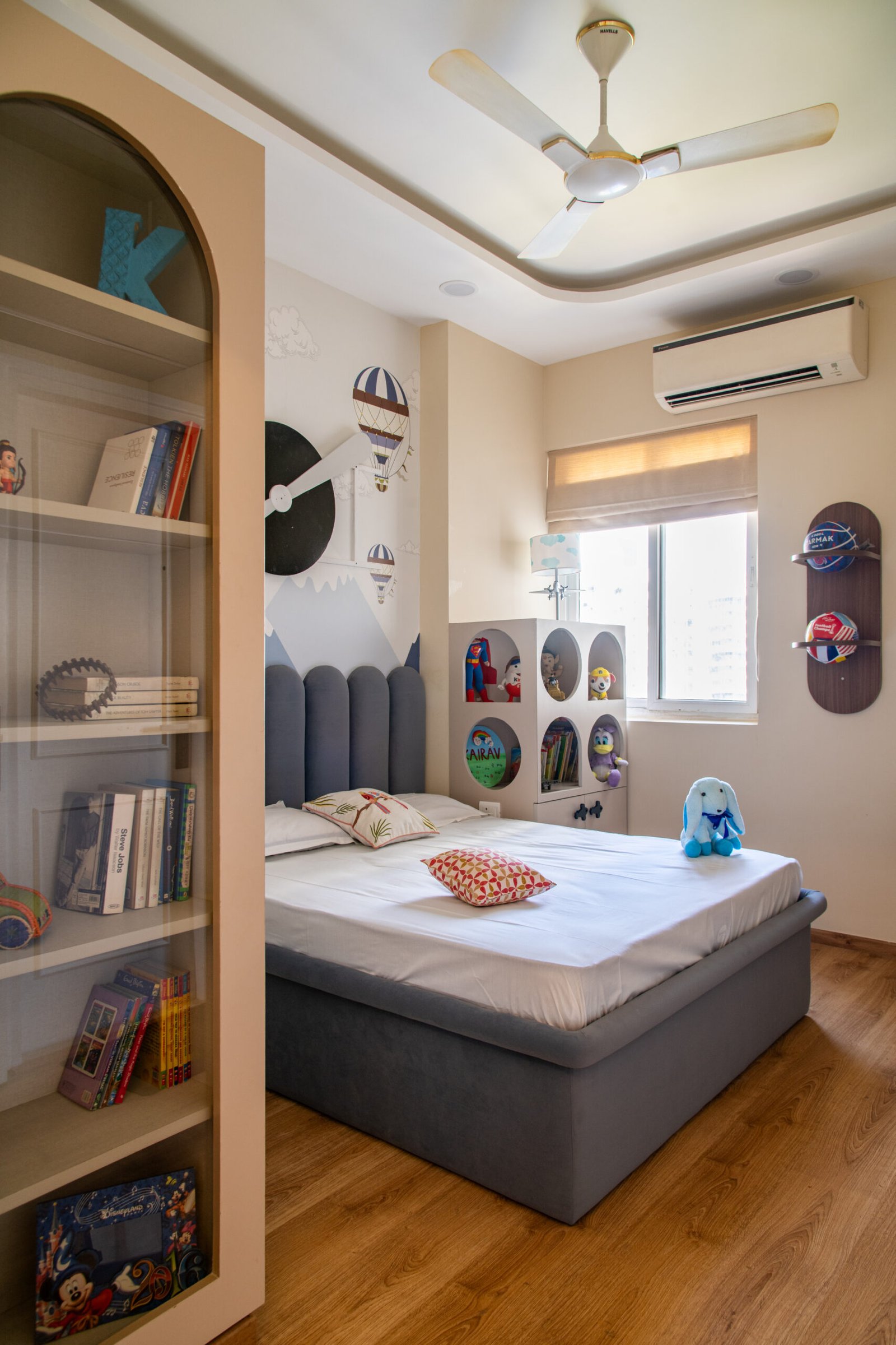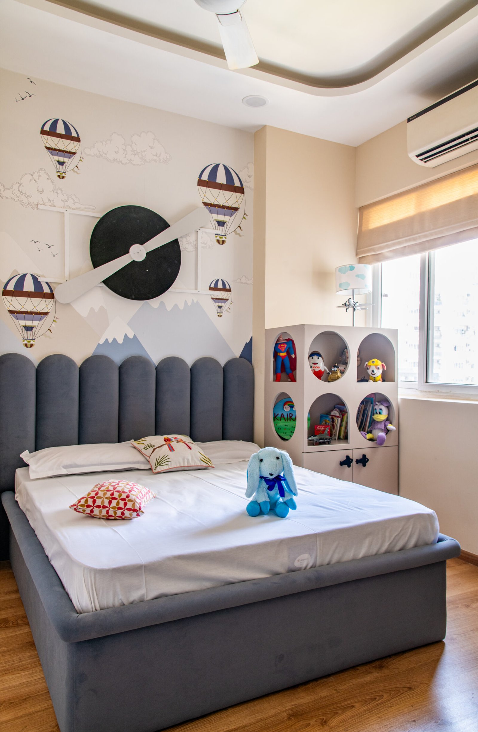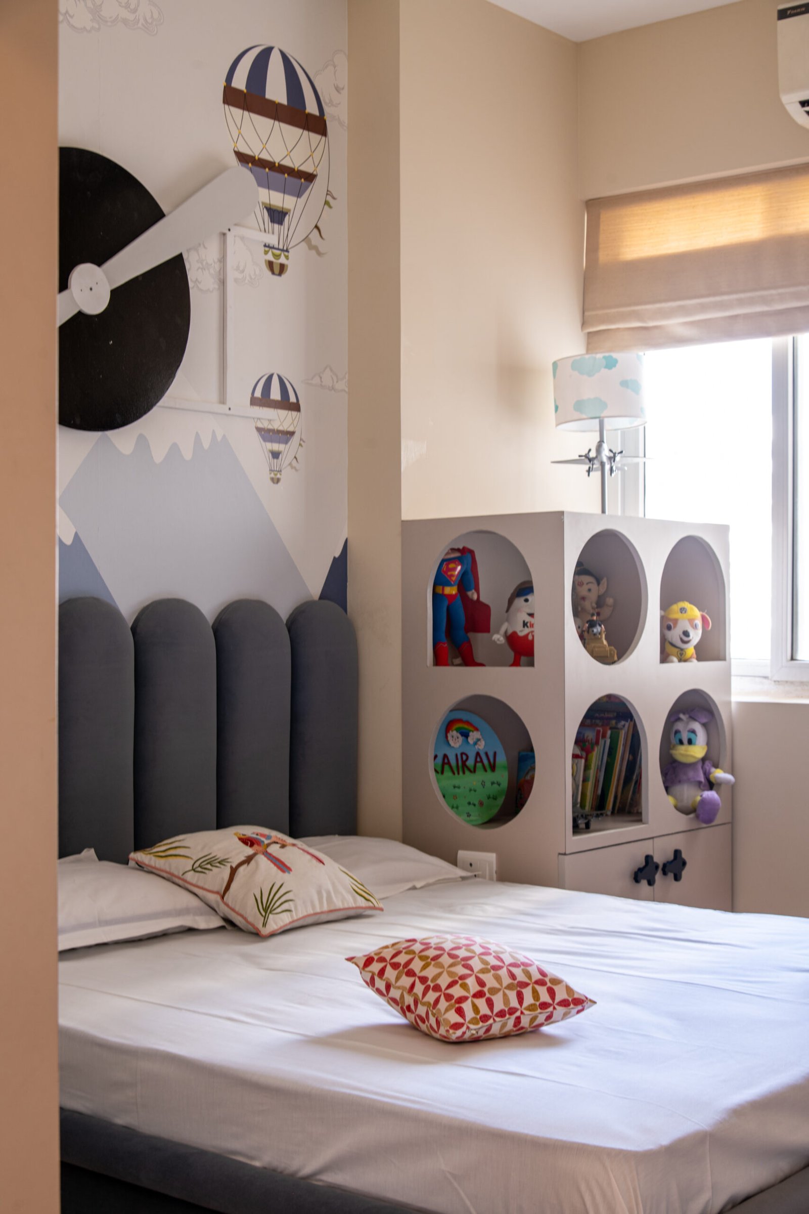 We used compact built-ins, a multi-use study nook, smart storage for toys and clothes, and a mural to create visual depth without crowding the space.